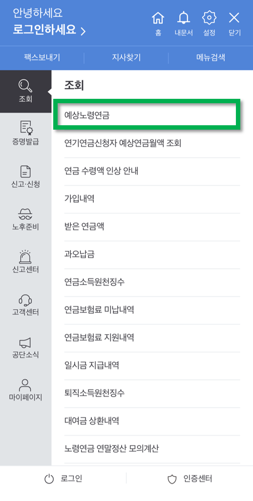 모바일 앱 '내 곁에 국민연금' → 전체 메뉴 → 예상노령연금