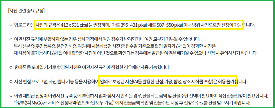 ■ 외교부 여권홈페이지(https://www.passport.go.kr)에서 여권용 사진 규정을 참고하여 규격에 맞는 사진 파일을 준비한 뒤 정부24 사이트에서 여권 재발급을 신청하시기 바랍니다.