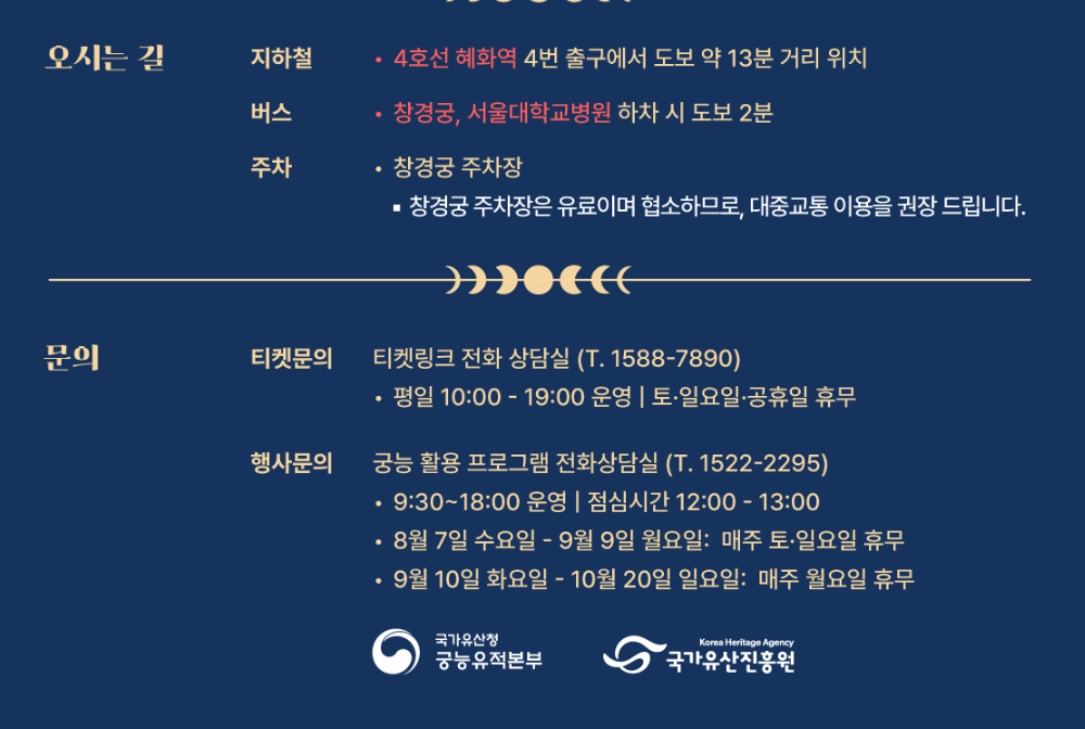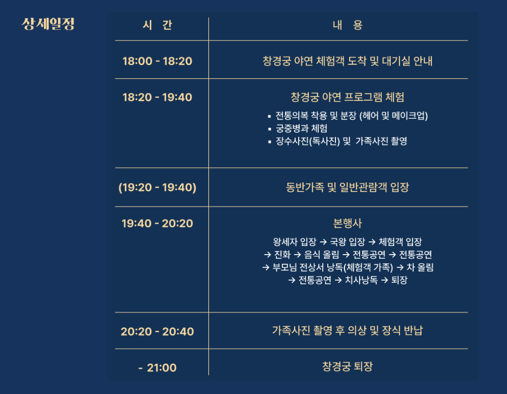 - 행사내용: 창경궁 야연은 조선시대 궁중 연향 재현, 전통 복식 및 다과 체험 등 공연과 체험이 결합된 문화 프로그램입니다.
