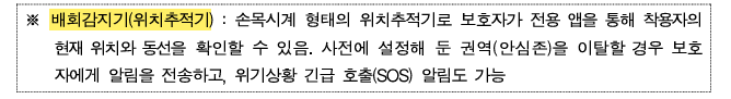 배회감지기(위치추적기)는 치매 환자 또는 발달장애인이 집을 벗어나거나 또는 정해진 구역을 벗어났을 때 이를 감지하여 신호를 보내는 장치입니다. 이 장치는 GPS를 통해 환자 또는 장애인의 위치를 실시간으로 추적할 수 있어 환자의 안전을 지키고 가족들에게는 안심을 주는 중요한 기계입니다.