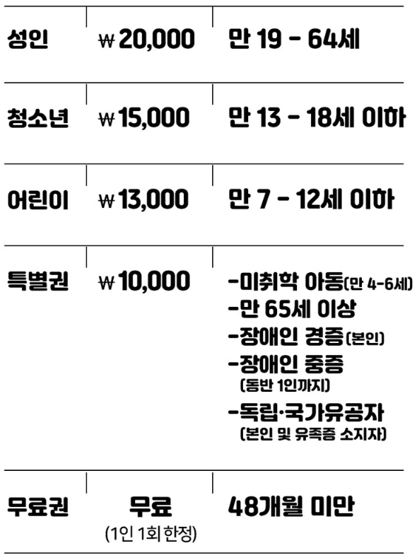 특별권 및 무료권은 현장 매표소에서 신분증, 학생증, 복지카드 등 증빙자료 확인 후 구매가능 합니다.